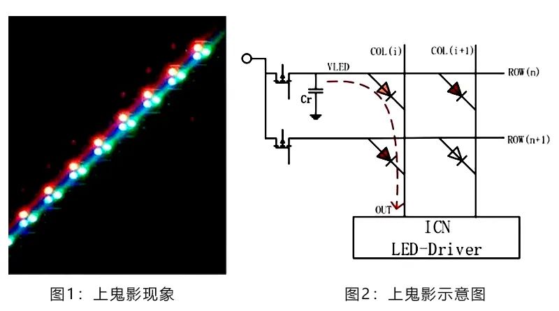 在扫描屏进行切换时,由于PMOS管开关的打开和关闭以及行线寄生电容Cr上的电荷泄放需要一段时间,因此在下一行扫VLED与OUT开启瞬间,上一行扫VLED的未释放的电荷有了导通路径。Row(n)打开时,行寄生电容Cr充电到VCC电位。切换到Row(n+1)时,Cr与OUT之间形成电位差,电荷通过灯珠进行泄放,产生LED隐亮。