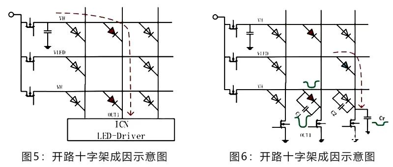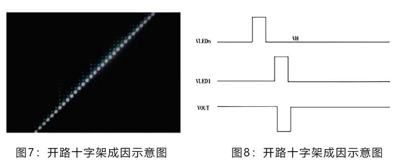 当出现灯珠开路,通道OUT1电压被拉低到0.5V以下甚至0V,并通过寄生电容C1、C2影响到列寄生电容Cr,当Cr电位被拉低时,与开路灯珠同一行的LED出现隐亮。将消隐行管的消隐电压调低可有效解决开路十字架问题即消隐电压VH<1.4V。业内某些行管同样利用可调消隐电压的方式,将消隐电压调低至1.4V以下来解决开路十字架,但这样会带来LED反压增大加速LED灯珠损坏及短路毛毛虫。