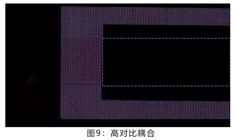 高对比耦合指在低亮的背景下,叠加高亮画面,低亮画面与高亮画面同行的区域出现偏色、偏暗现象,如图9所示虚线处为叠加高亮画面。高对比耦合现象为列通道通过行管相互干扰造成,通过设计钳位电压的方式即放电结束后保持在某一电平,从而调低行管消隐电压,即可一定程度改善高对比耦合。但此设计方法会带来短路列偏暗、低灰偏红、灯珠VF值偏大等问题。从行驱动角度来改善高对比耦合可通过调低消隐电压,但会带来灯珠反压偏大,短路毛毛虫问题。