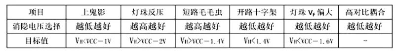综上可知,行管消隐电压的选择面临上述六大问题的挑战,且分别存在一定的挑战,消隐电压不能过高或过低。通常开路十字架由恒流驱动侦测消除,因为过低的消隐电压会降低灯珠长期使用的可靠性。下表总结了各种情况下消隐电压合适的范围。